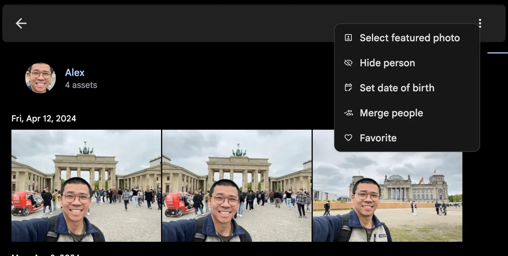 Upon clicking on a person, a list of assets that contain their face will be shown.