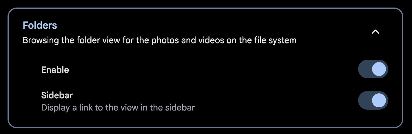 Folder view provides an additional view besides the timeline that is similar to a file explorer. It allows you to navigate through the folders and files in the library. This feature is handy for a highly curated and customized external library or a nicely configured storage template.