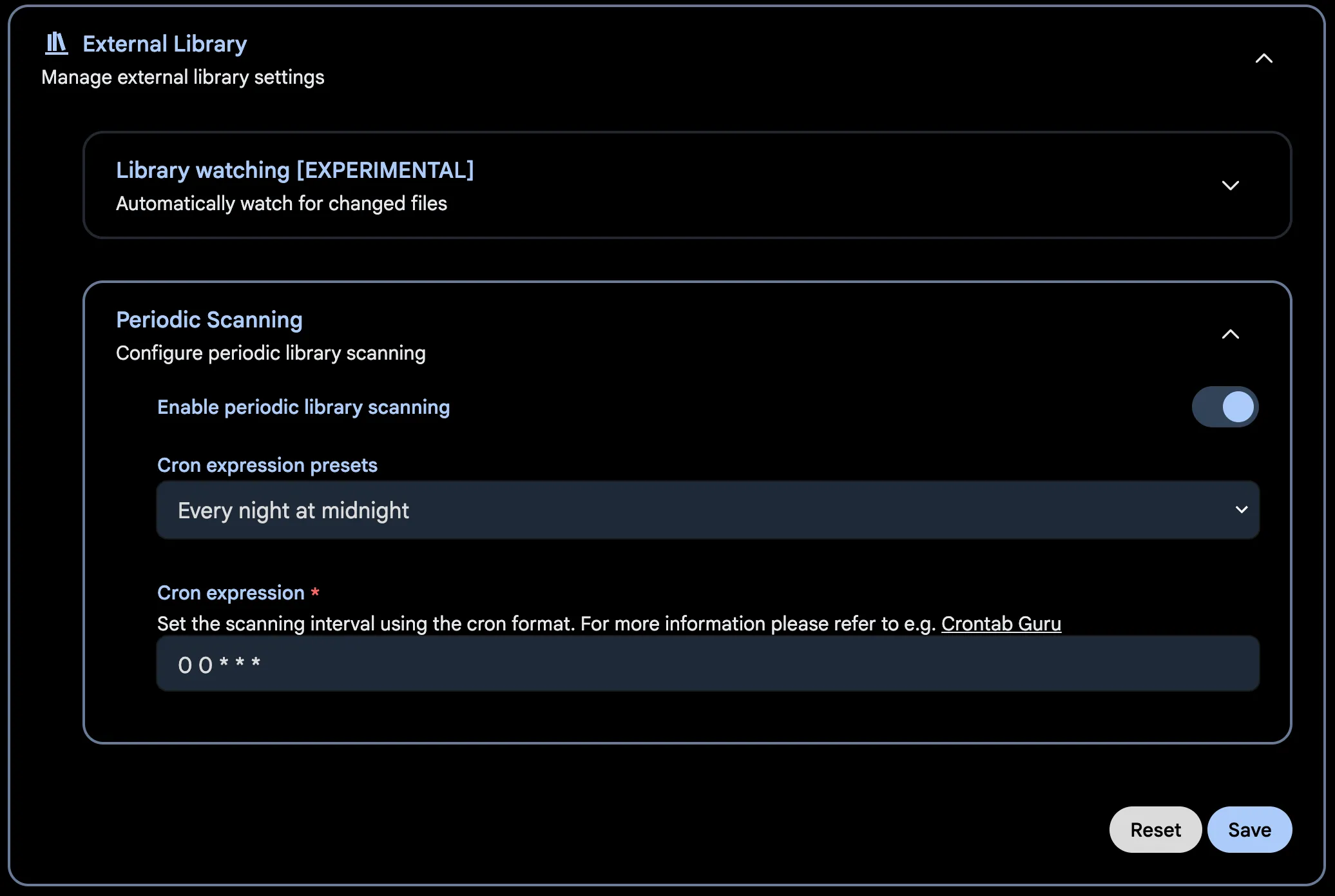 You can set the scanning interval using the preset or cron format. For more information you can refer to Crontab Guru.