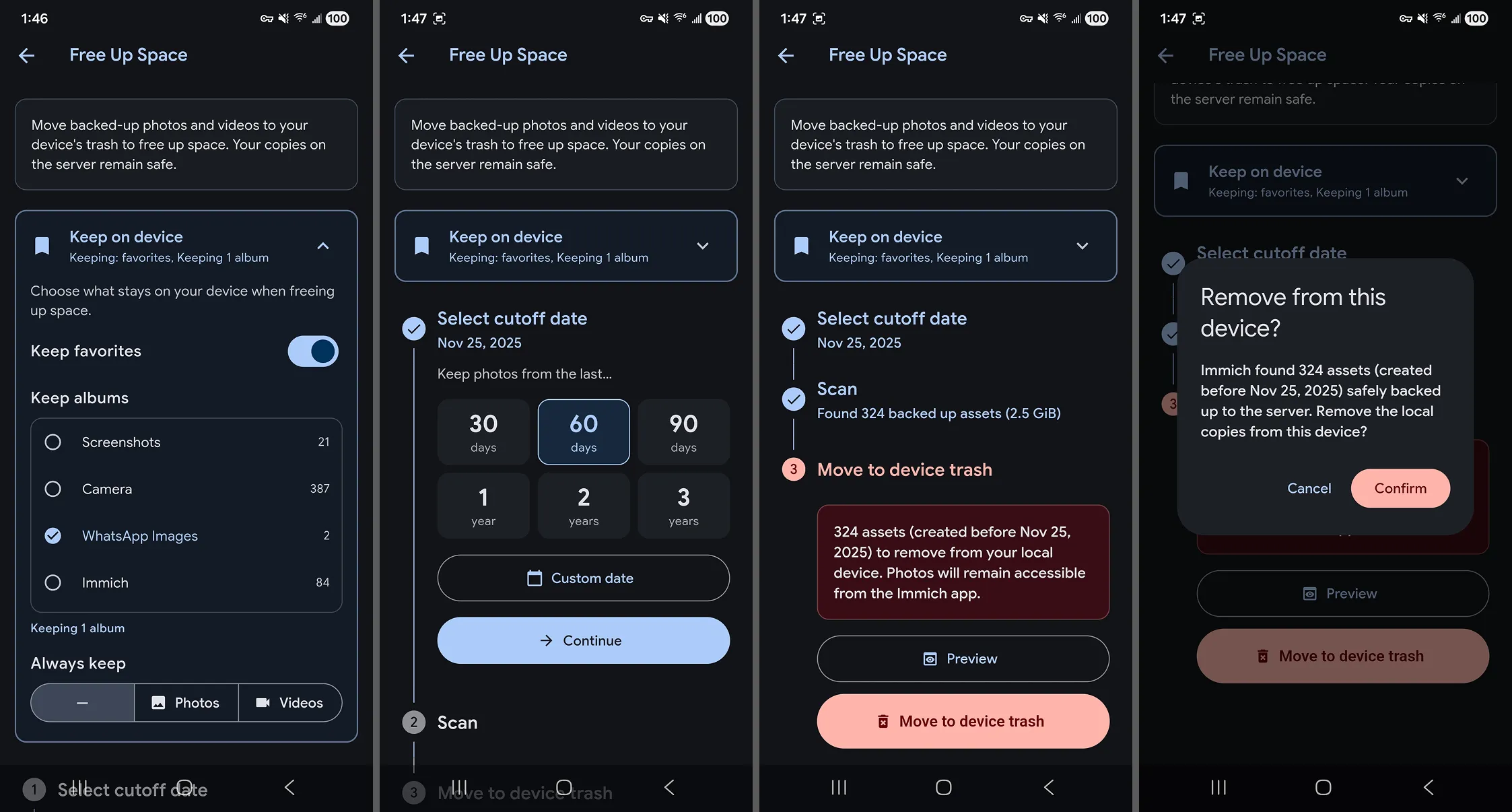 Free Up Space allows you to remove local media files from your device that have already been successfully backed up to your Immich server (and are not in Immich trash). This helps reclaim storage on your mobile device without losing your memories.