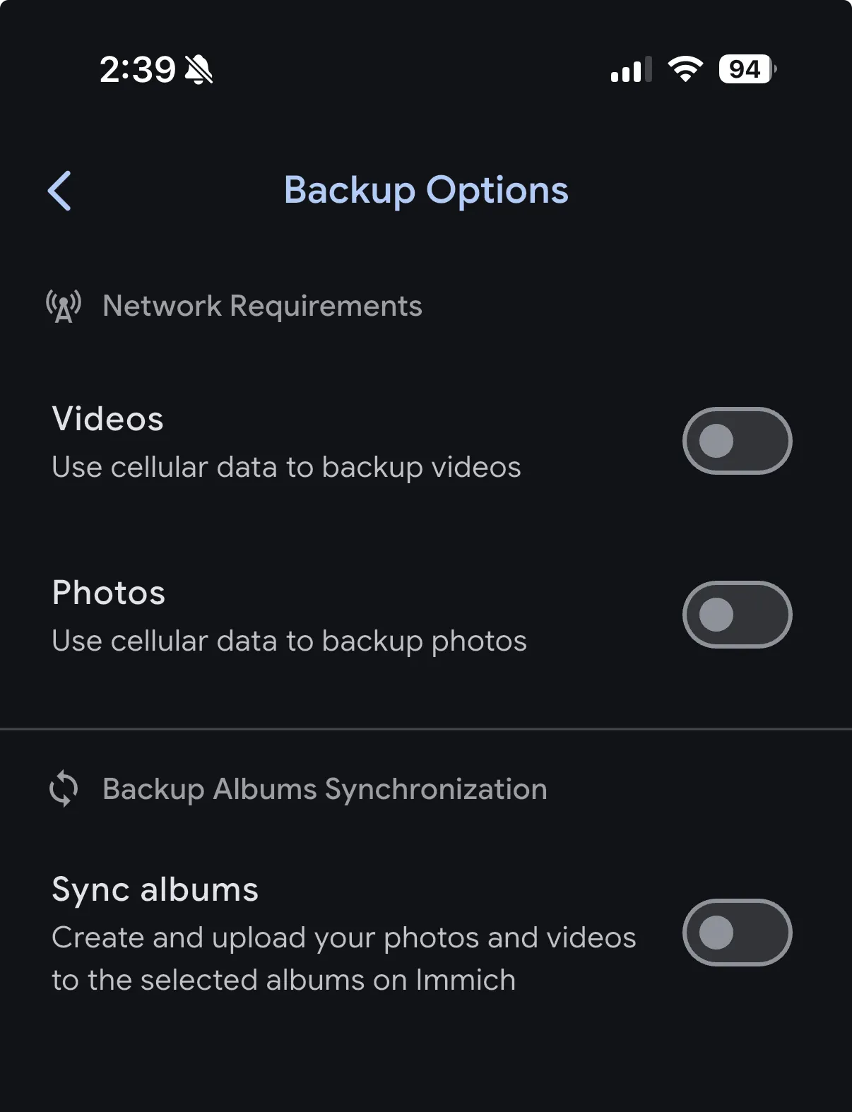 By default, Immich will only upload photos and videos when connected to Wi-Fi. You can change this behavior in the backup settings page.